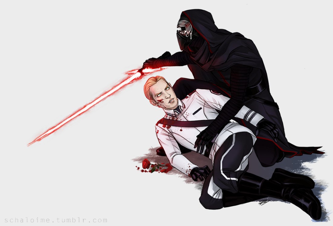 A very dramatic scene from his gorgeous fanficiton Loyalty. Hux is shot, Ren protects him. Go read it.