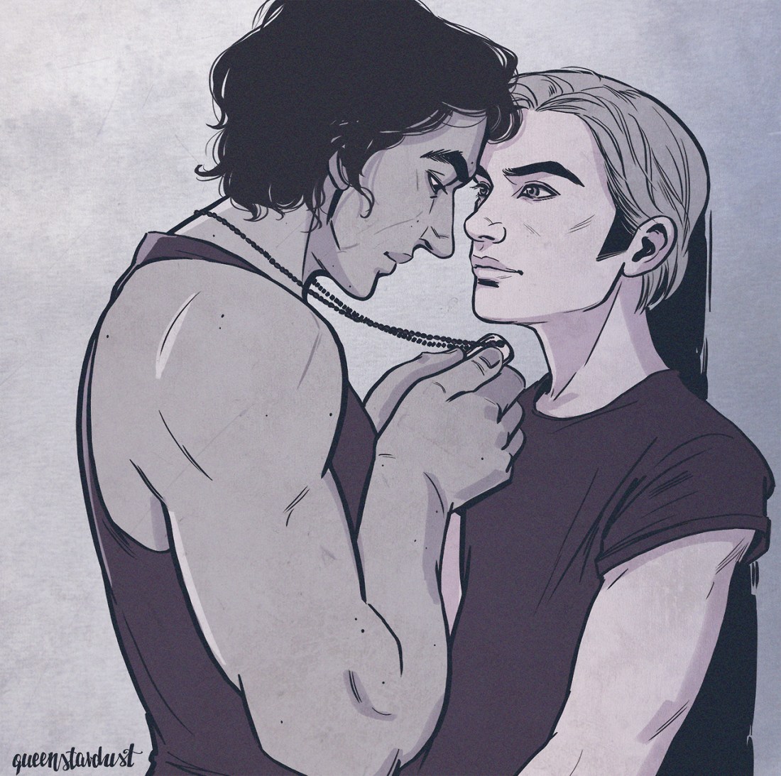 loserchildhotpants asked me to illustrate a scene from her series “Not About Angels”. It was a tough decision, (honestly, there are so many good scenes!) but in the end I decided to draw this one, where Hux gives Kylo one of his dogtags before he leaves ♡