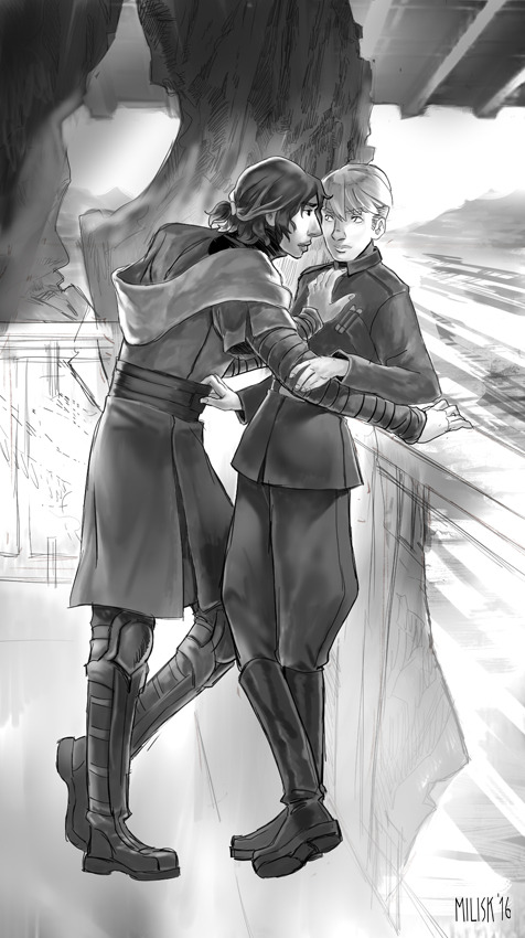He was introduced as Armitage Hux, son of the general who was also in attendance at the meetings, and he appeared unfazed by the presence of his seniors and betters. He sat by impassively while his father negotiated with Ben’s mother, across the massive tent from Ben, who could not look away from him. Ben rarely traveled outside of Luke’s school, and he had never seen a man with Hux’s coloring. It was beautiful.