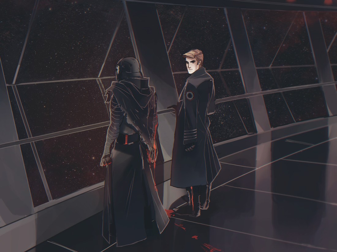 Ren says nothing. Hux opens his mouth to tell him to leave if he’s going to be such awful company, but then something drips between them. Hux blinks, looks down, and sees the black-red color of blood on the floor. He steps back.