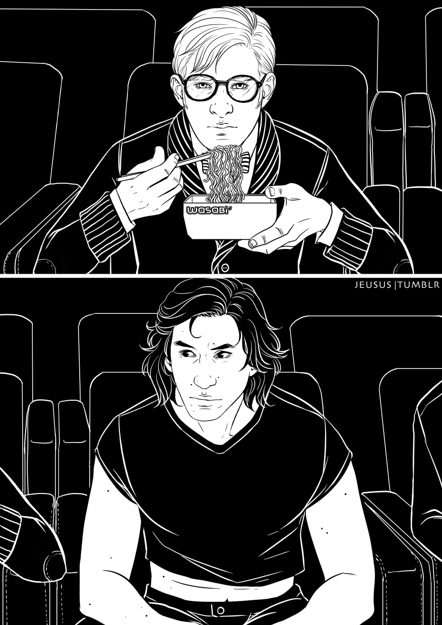 Hux didn’t book one of those kinky couple’s chairs. The thick armrest of the run-of-the-mill seat blocked Ben’s feeble attempts to make their thighs brush as Hux fumbled with his satchel. The room was quite packed as well, and the previews started playing without Hux saying anything. However, he did manage to produce a small tupperware filled with nuts and another one with takeout from Wasabi—soup, by the looks of it. Hux got a pair of disposable chopsticks, and tried to look like a person who was not slurping ramen at the cinema.
