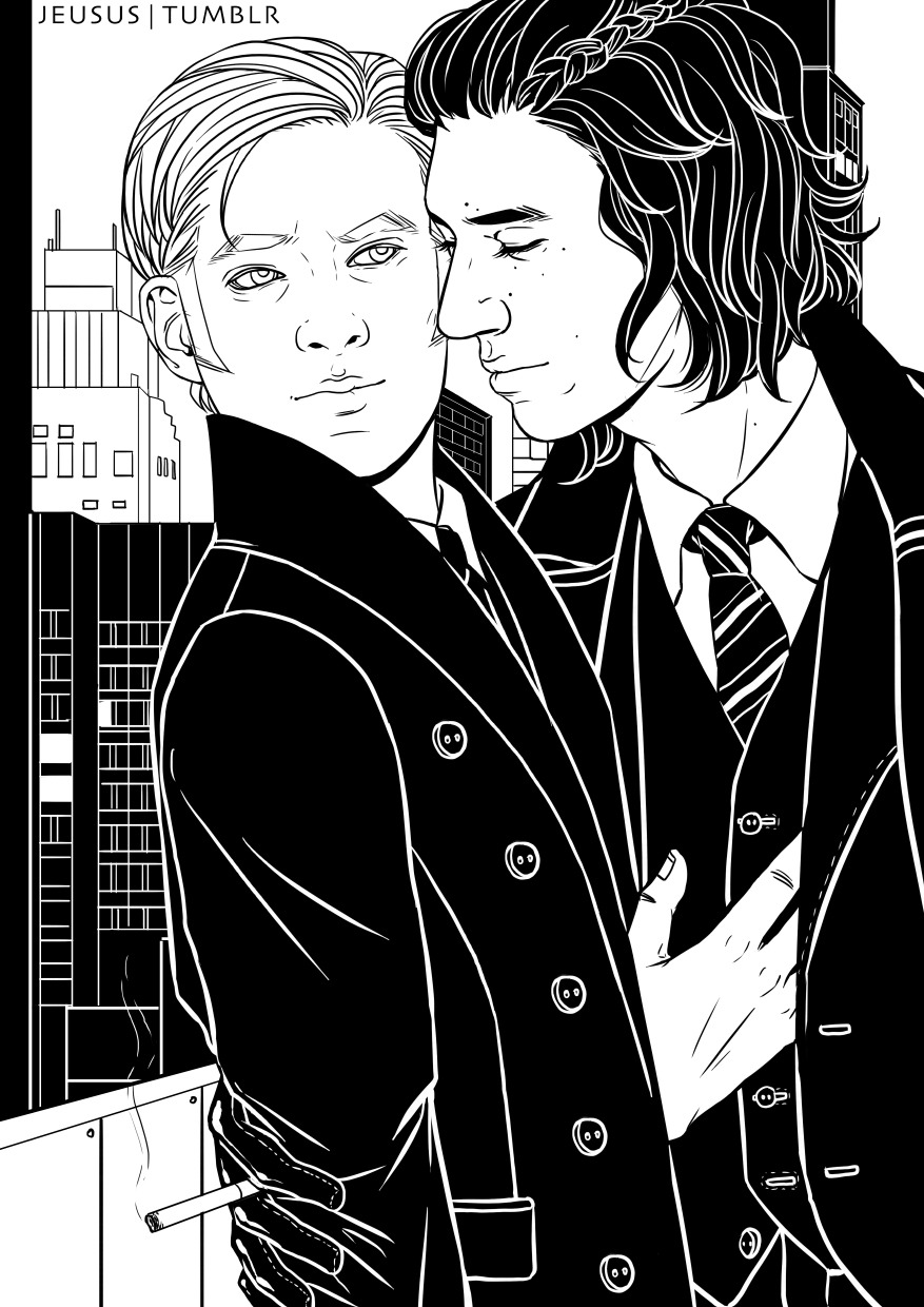 Ren, of course, couldn’t help but make a dramatic entrance, and Hux fell for it like it was the first time. His cigarette was already lit as he stepped on the balcony, like he couldn’t care less whether fire alarms were triggered in his wake, his hair in a partial French braid, and his shiny leather gloves looked obscene. Hux almost choked on the smoke of his cigarette. Rey was standing a few feet away from him, so that anybody watching would think it was an accident that they all flocked here for nicotine. As far as Hux could tell, only the surrounding skyscrapers bore witness.
