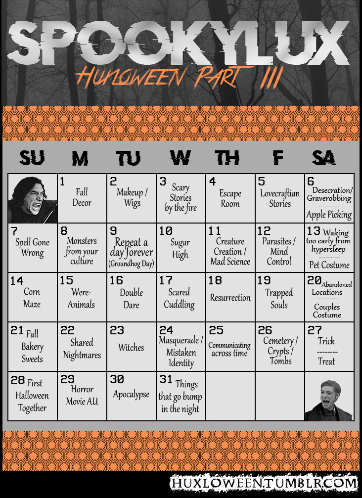 This is a casual event, so there’s no pressure to post something on the exact day of the prompt, or even to post something every day. Just pick the prompts you like and go for it! Remember to tag #huxloween and @ us (@huxloween) so we know to reblog your work, or submit it directly to the blog. We also have an AO3 collection that you may use.