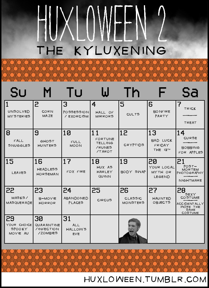 Welcome to Huxloween 2017! We’ve got a prompt a day (and two per Saturday) to inspire your Halloween and horror-themed kylux creative works.