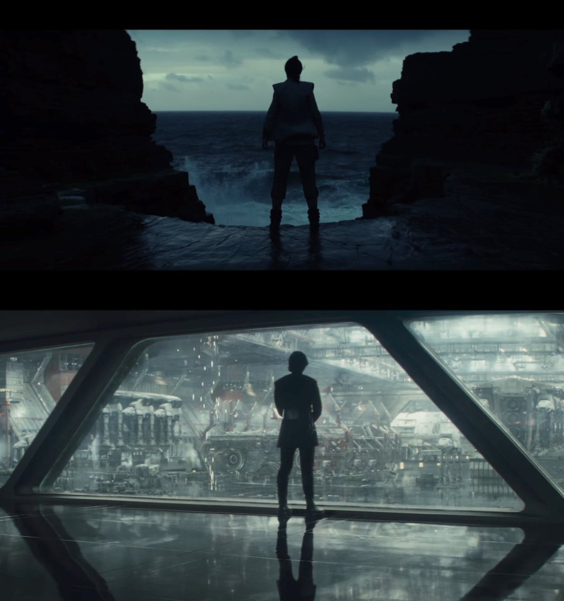 Also, space opens up for Rey but it encloses Kylo. The camera is directly behind Rey, which emphasizes that she’s facing the power she sees before her straightforwardly. Kylo, we see from an off-center angle, which makes him seem more pensive? Troubled? Unsure about his connection to what he’s regarding? His stance is firm, though, and his reflection is clear. He thinks he knows where he stands.