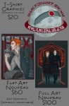The exact price is determined by the number of characters (up to three), the complexity of details such as the position, garments, background, character design, etc. Email any inquiries to marspragge @ gmail.com with “commission” somewhere in the email title.
